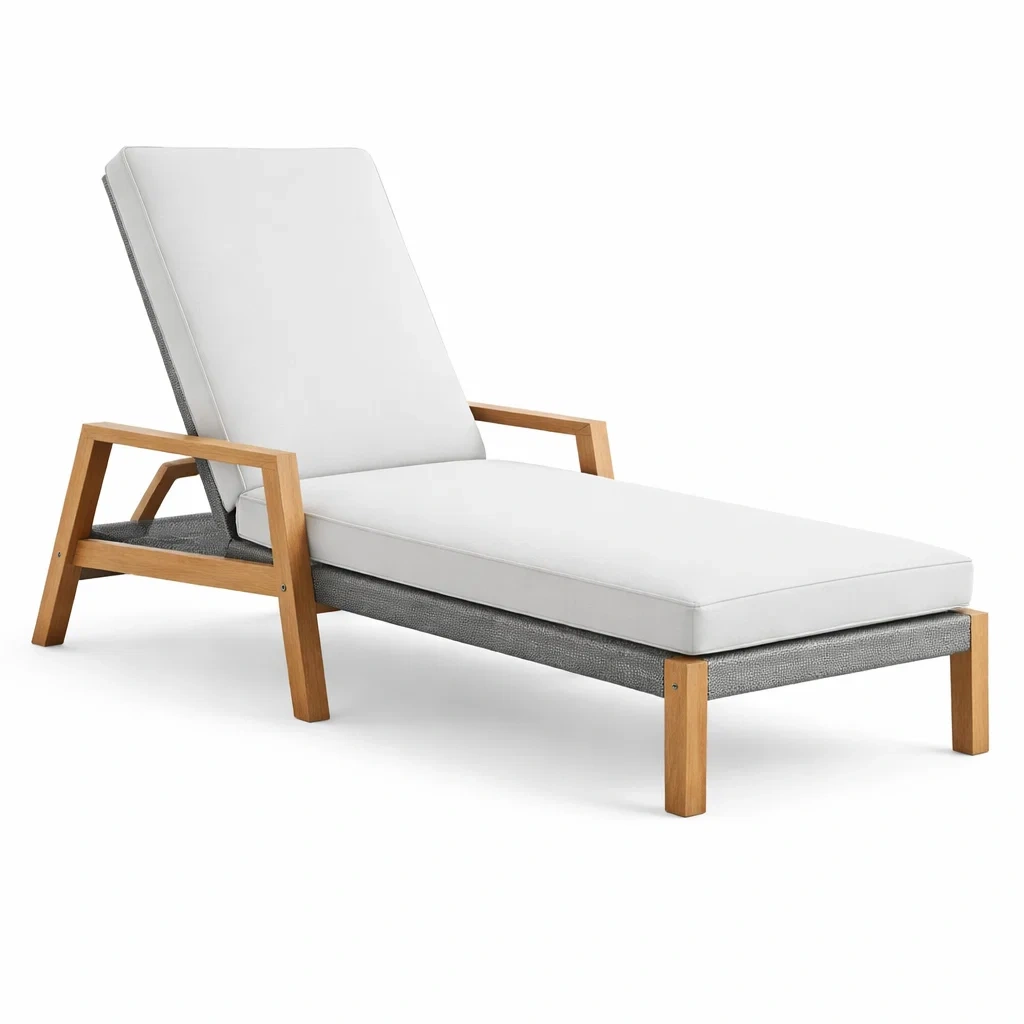Sdraio in legno di teak con cuscini in tessuto grigio