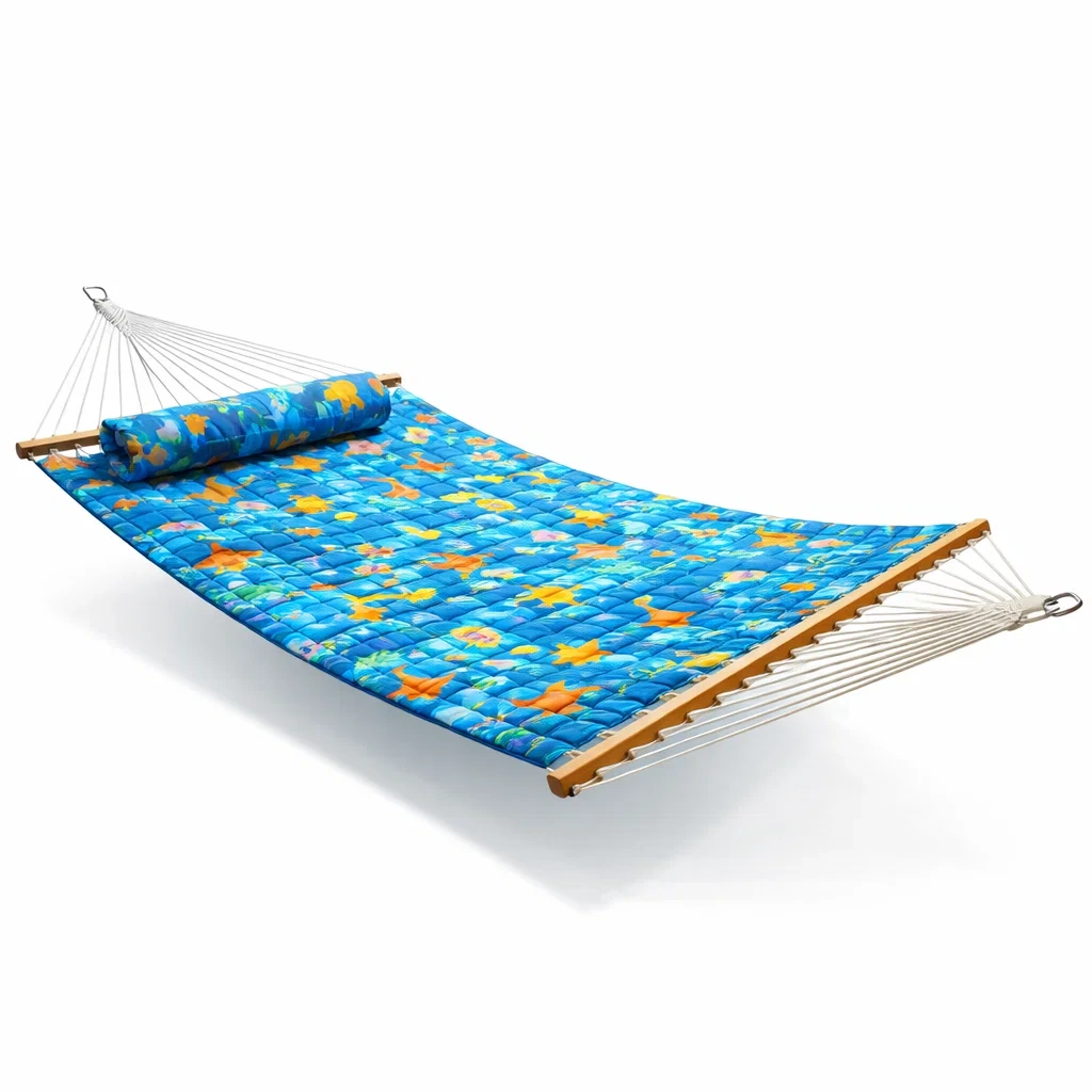Materiale: Tessuto in poliestere per l'amaca e cuscino, legno per il supporto.