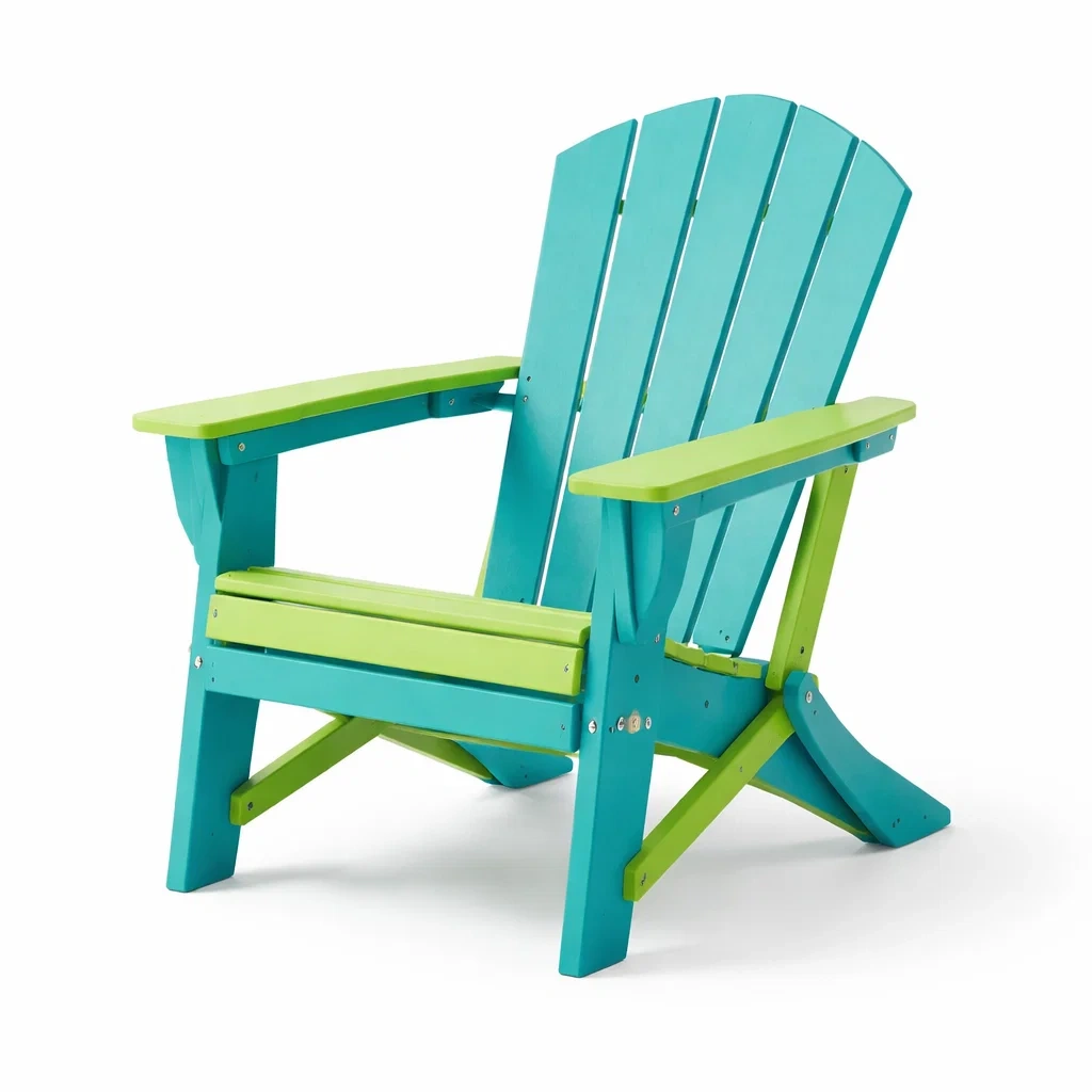 Realizzata in plastica riciclata, questa sedia Adirondack presenta una struttura robusta. Il design include colori contrastanti: Turchese per la base e Verde per i dettagli. Adatta per uso esterno, la sedia offre una funzione pieghevole per una facile conservazione. Dimensioni 90 cm x 75 cm x 88 cm.