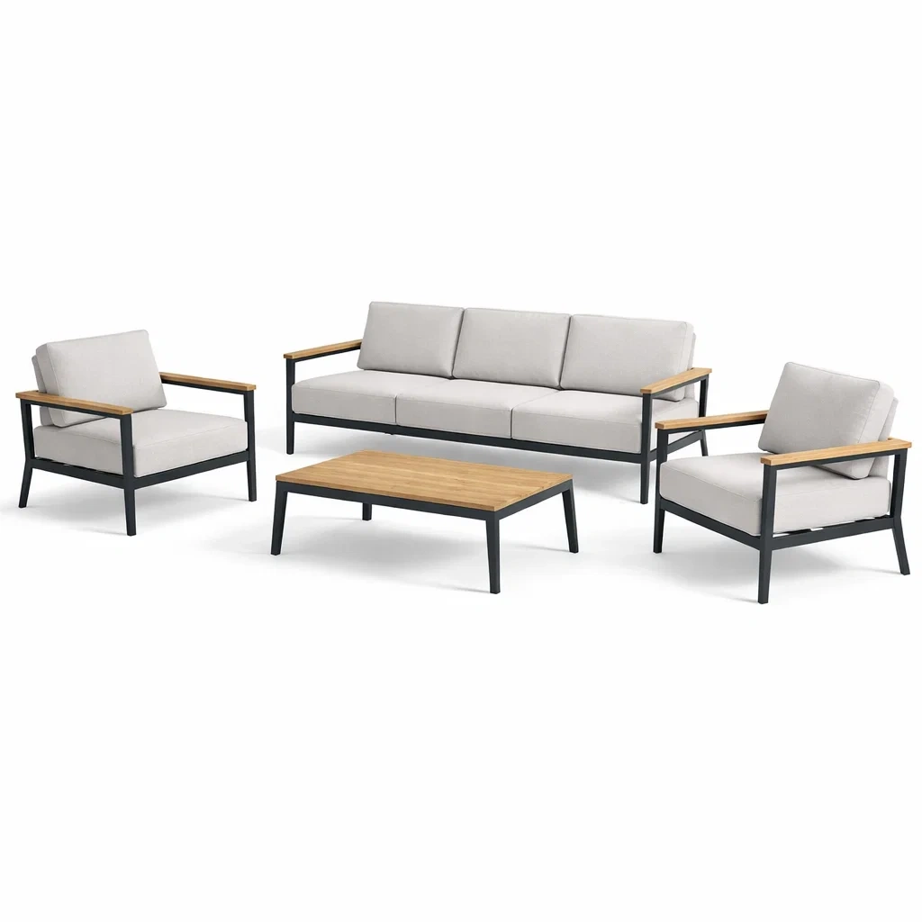 Struttura in alluminio e braccioli in legno naturale. Cuscini realizzati in poliestere grigio. Divano a tre posti: 200 cm x 75 cm x 70 cm. Poltrona: 75 cm x 75 cm x 70 cm. Tavolino: 100 cm x 60 cm x 40 cm. Il peso complessivo è di 45 kg. Pulire con un panno umido.