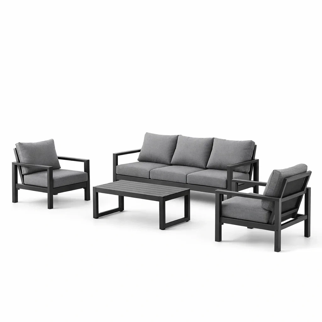 Il set di mobili da esterno comprende un divano a tre posti, due poltrone e un tavolino. La struttura è in metallo verniciato a polvere, resistente agli agenti atmosferici. I cuscini sono realizzati in poliestere, facili da rimuovere per una pulizia comoda.