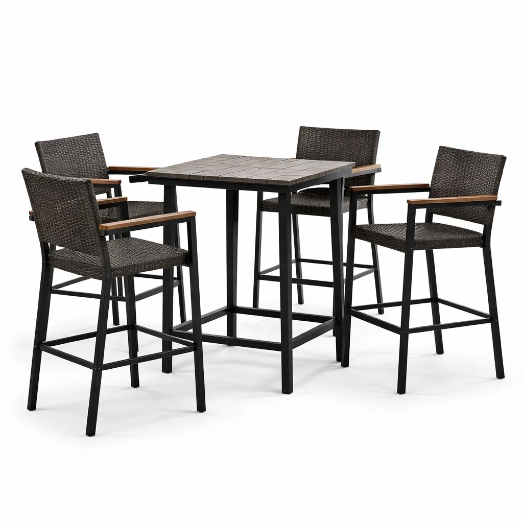Materiale: Tavolo con piano in legno composito; Sedie in rattan sintetico; Struttura in acciaio.