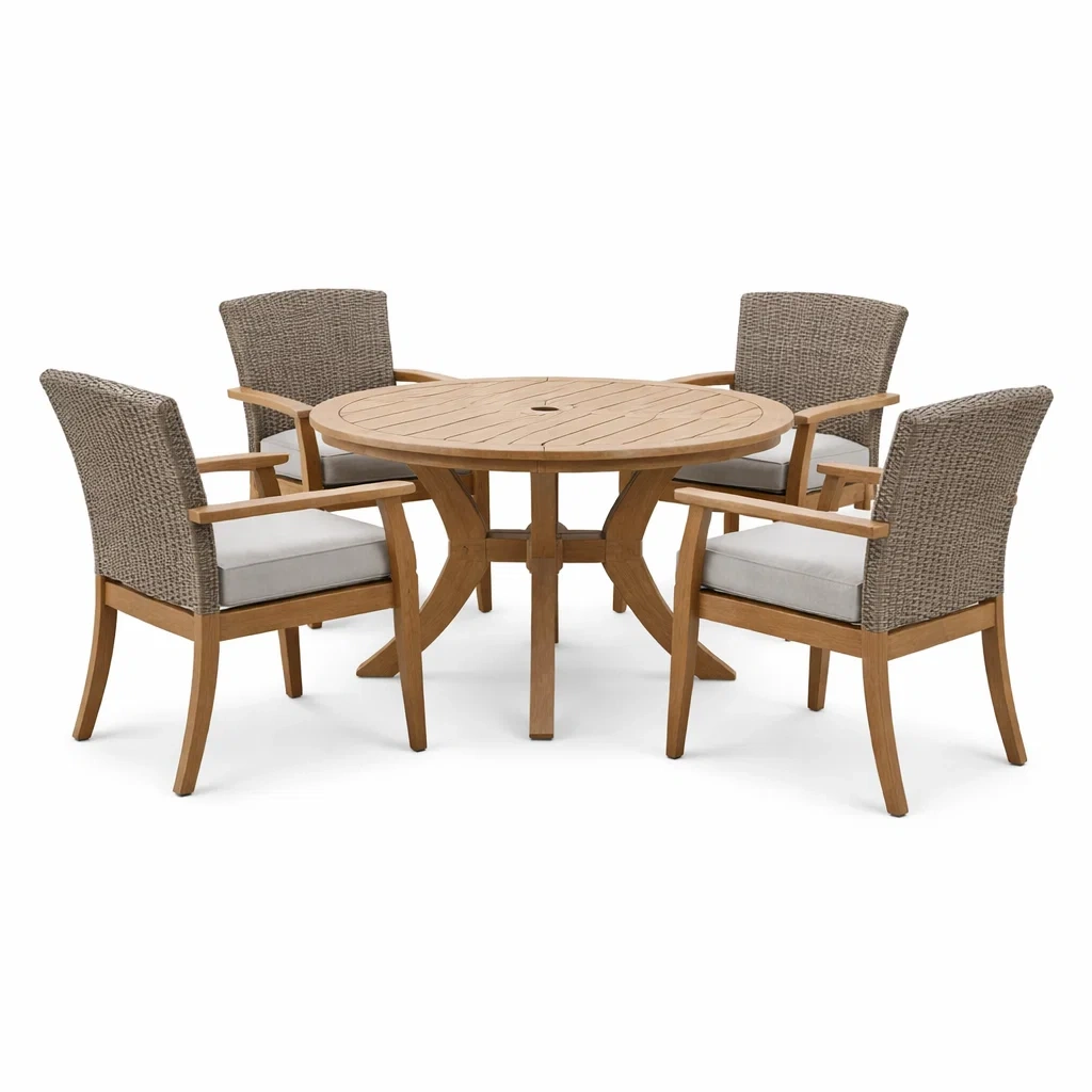 Il set da pranzo comprende un tavolo rotondo in legno di teak, diametro 120 cm, altezza 75 cm. Le sedie sono in rattan sintetico grigio, con cuscini in poliestere. Ciascuna sedia misura 60 cm di larghezza, 62 cm di profondità e 86 cm di altezza.