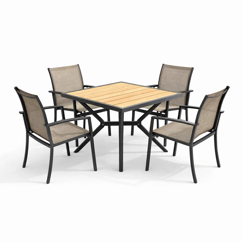Forma e Colore: Tavolo quadrato con superfici color legno chiaro e sedie marroni.